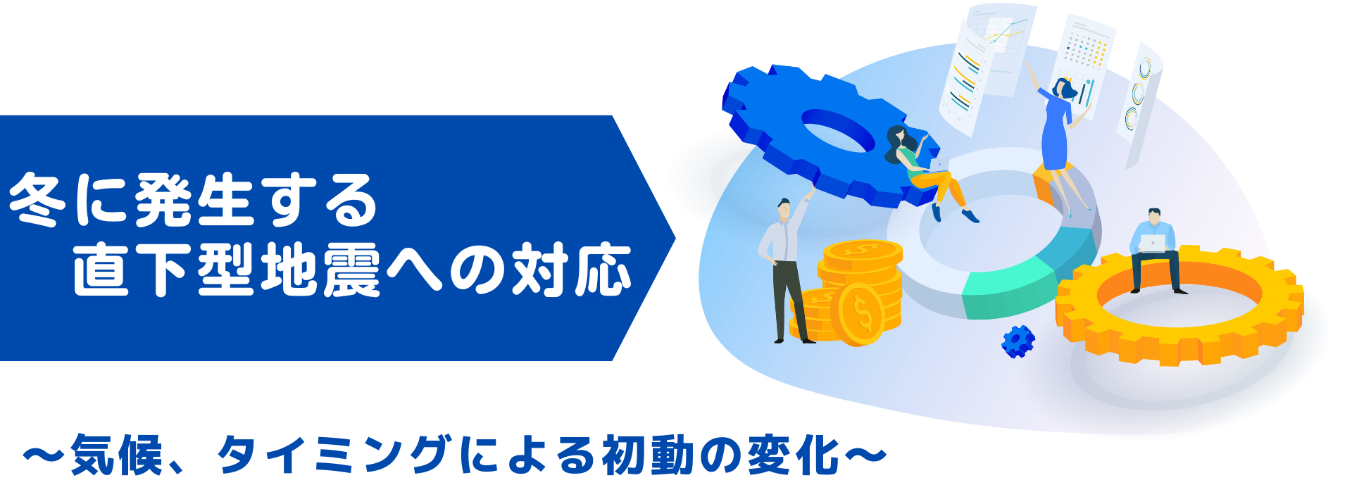 真夏に地震が発生し、一旦建屋外に避難はしたものの、余震が継続する中で建屋の中には入れない、でも外に居たら熱中症になってしまうという状況を想定した各種備えができているでしょうか。あるいは真冬に発生した際の避難行動について、貴重品や防寒着を即座に持ち出しやすいように平時から準備をしているでしょうか。自拠点の発電能力なども考慮し、季節要因を念頭に置いた対策案の拡充を検討しておくことが必要です。